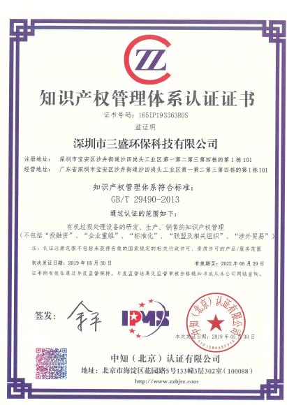 恭喜深圳市三盛環(huán)??萍加邢薰緲s獲《知識產(chǎn)權(quán)管理體系認證證書》